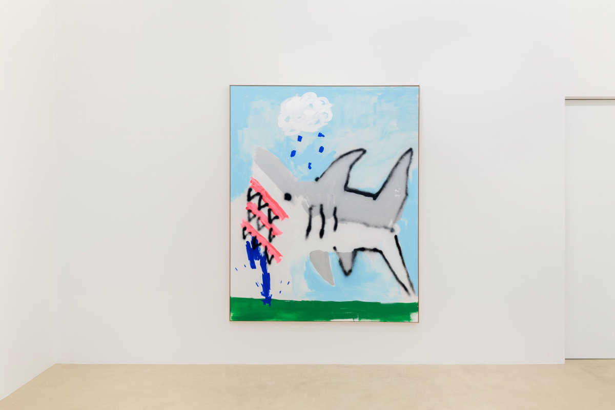Oscillant, selon ses propres mots, entre le bienveillant et l’effrayant, Nava présente une œuvre à la fois grotesque et ludique. Issues de l’univers des contes, ses créatures en évoquent surtout les adaptations hollywoodiennes ou folkloriques, sans toutefois nier leur violence latente. Le Speartooth Rain Maker présenté en donation au MAM est parfaitement représentatif de cette ambition. Motif récurrent dans l’œuvre de Nava, le féroce prédateur aux rangées de dents redoutables ne peut manquer d’évoquer le terrifiant film de Spielberg ; mais le requin devient ici un gros poisson inoffensif sinon attendrissant, une créature magique capable de flotter dans le ciel et de faire tomber la pluie. Peint à l’acrylique, le tableau se trouve réhaussé de passages au crayon gras lui conférant un aspect chatoyant, témoignant du plaisir manifeste de l’artiste à travailler ses surfaces et à combiner différents types de matières.